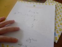 はじめて、自分で書いたラブレターは、パパへ♪ 「なんて書くの?」と、私。 「あのね。あのね。おこるな。ありがとう。ってかくのぉ」と、ドーターちゃん。大爆笑しながら、書き方を教え、まだまだめちゃくちゃな、アーティスティックな字を並べ。パパの好きなヒヨコの便箋を選び、なんとか書き上げました。