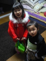 お正月ぐらいは、と、思って着物を着せています。居心地が悪くすぐに脱いでしまいますが、この姿をじぃーじや、ばぁーばに自慢したい2人♪