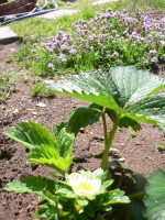 庭のイチゴの花が咲きました。今年は蜂さんが少ないって言ってます。どんなイチゴができるかな?