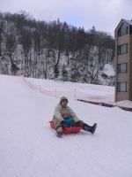ドーターちゃんを横目に貸切状態のソリ会場で、プリンス君とパパはソリ満喫。
